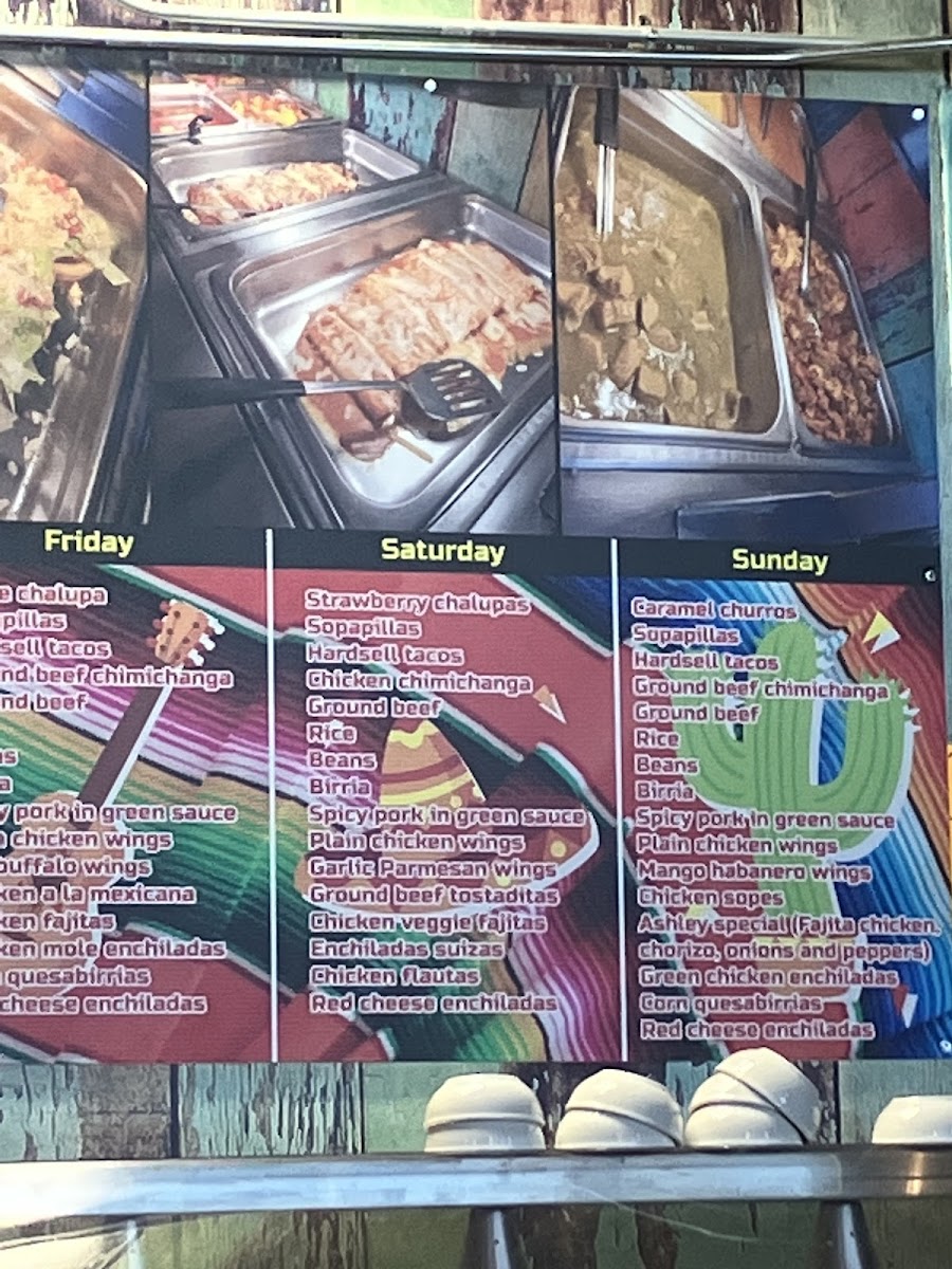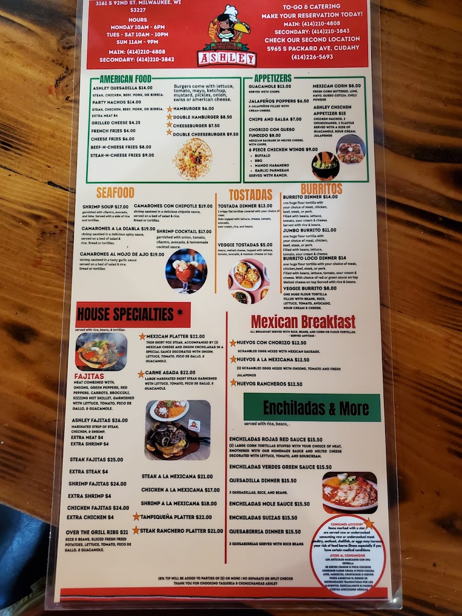 In the Enchiladas section, you'll find options such as Enchiladas Mole and Enchiladas Rojas, with the rich and flavorful Enchiladas Suizas and Enchiladas Verdes catering to a variety of tastes. For those seeking something sizzling, the Ashley Fajitas, along with Chicken Fajitas and Steak Fajitas, are sure to satisfy. And if you're craving seafood, dishes like Camarones Al Mojo and Shrimp Cocktail offer a delightful selection of fresh flavors.
